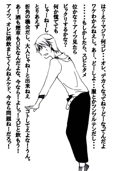大人の姿だったら、きっとスピも飲ませてくれるぜ!よしっ!!ってな感じで意気込んでいくんですが、でも、中身は14歳のカズくんのままなので飲ませてくれないんです。きっと(笑)